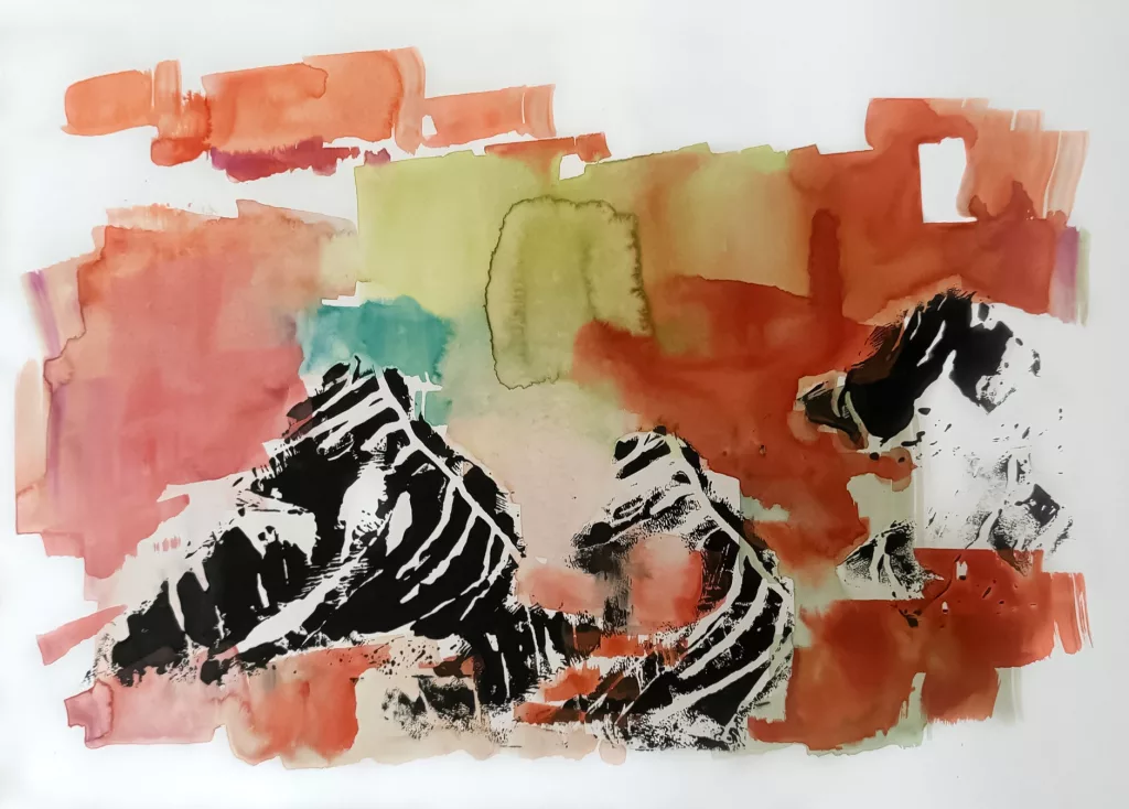 Dans ses peintures sur toile à l’acrylique avec pigment, en technique mixte ou à l’aquarelle et linogravure, Nadia Merzoug cherche une teinte parfaite et intense, de la profondeur et de la poésie. Son geste est vif et rapide. Les généreux aplats de couleur se rencontrent, s’opposent ou s’entrechoquent.