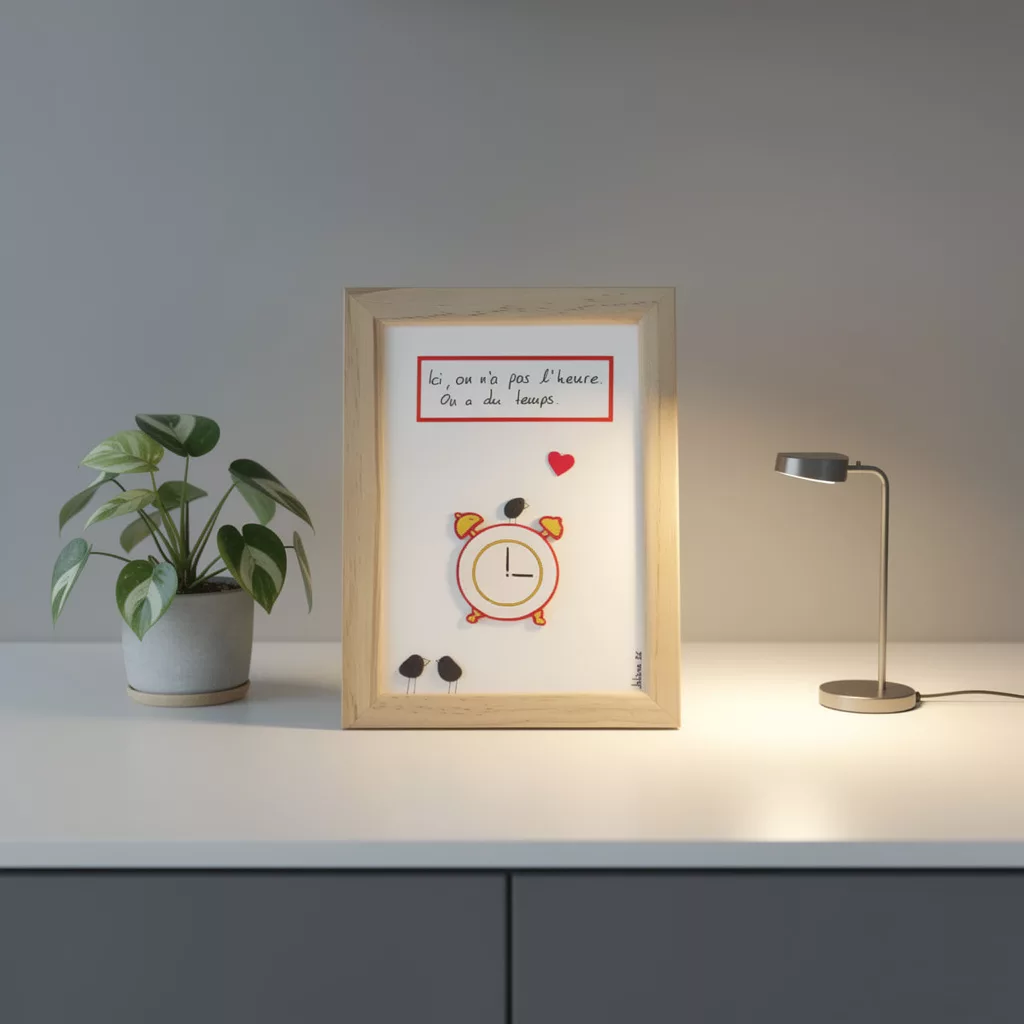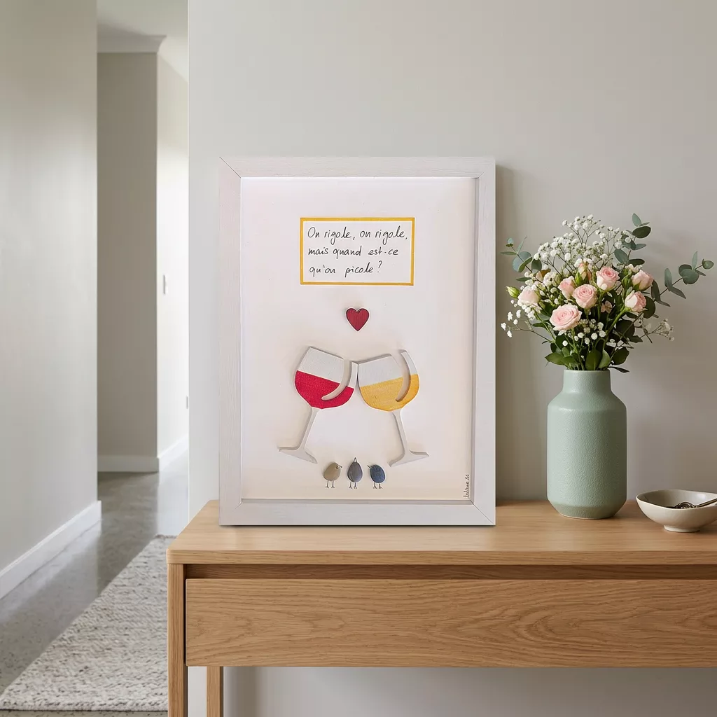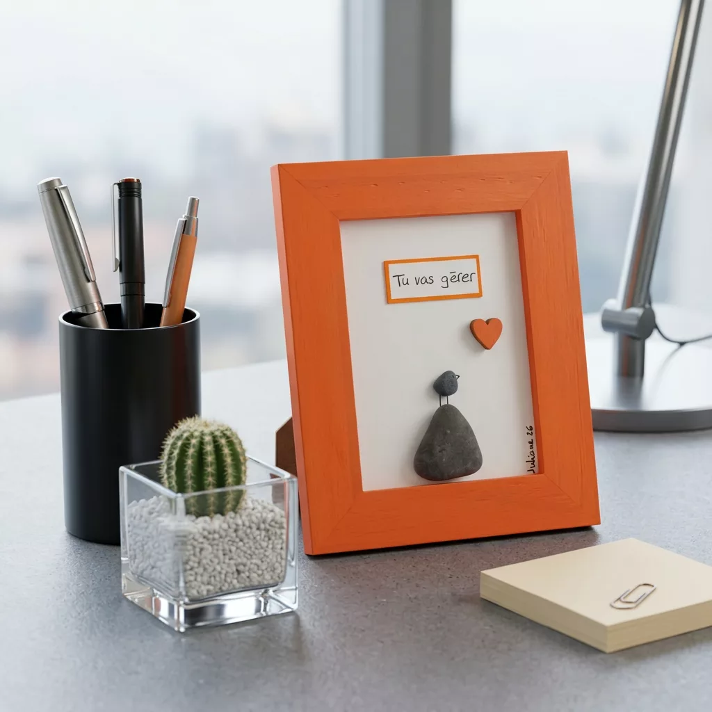 Lors de ses balades au bord du Léman et dans les campagnes genevoises, elle ramasse galets et bois flotté. De ces éléments naissent les cadres ‘’piou-pious’’ entre poésie, rêverie, authenticité et une touche de folie.