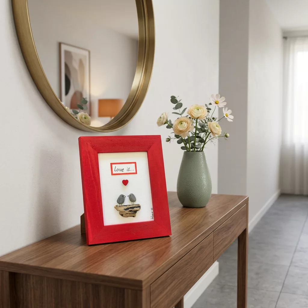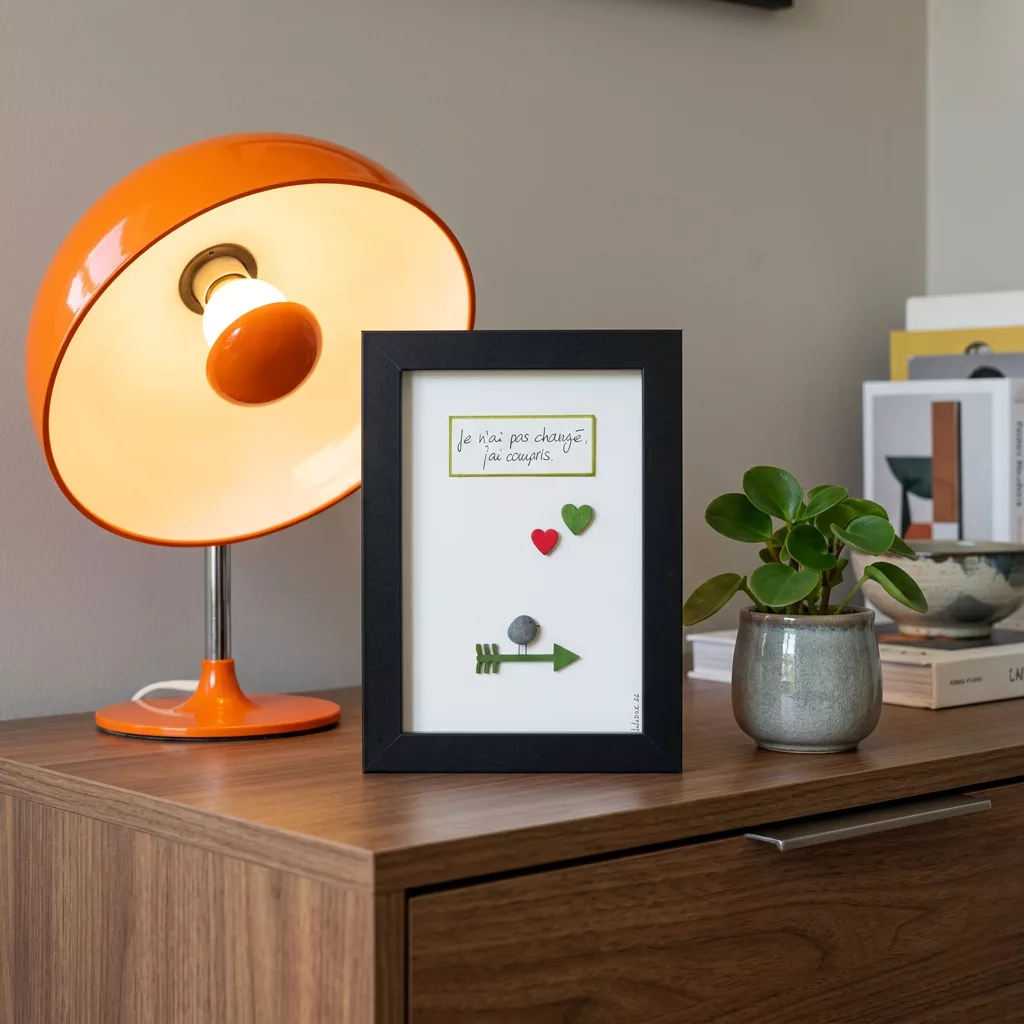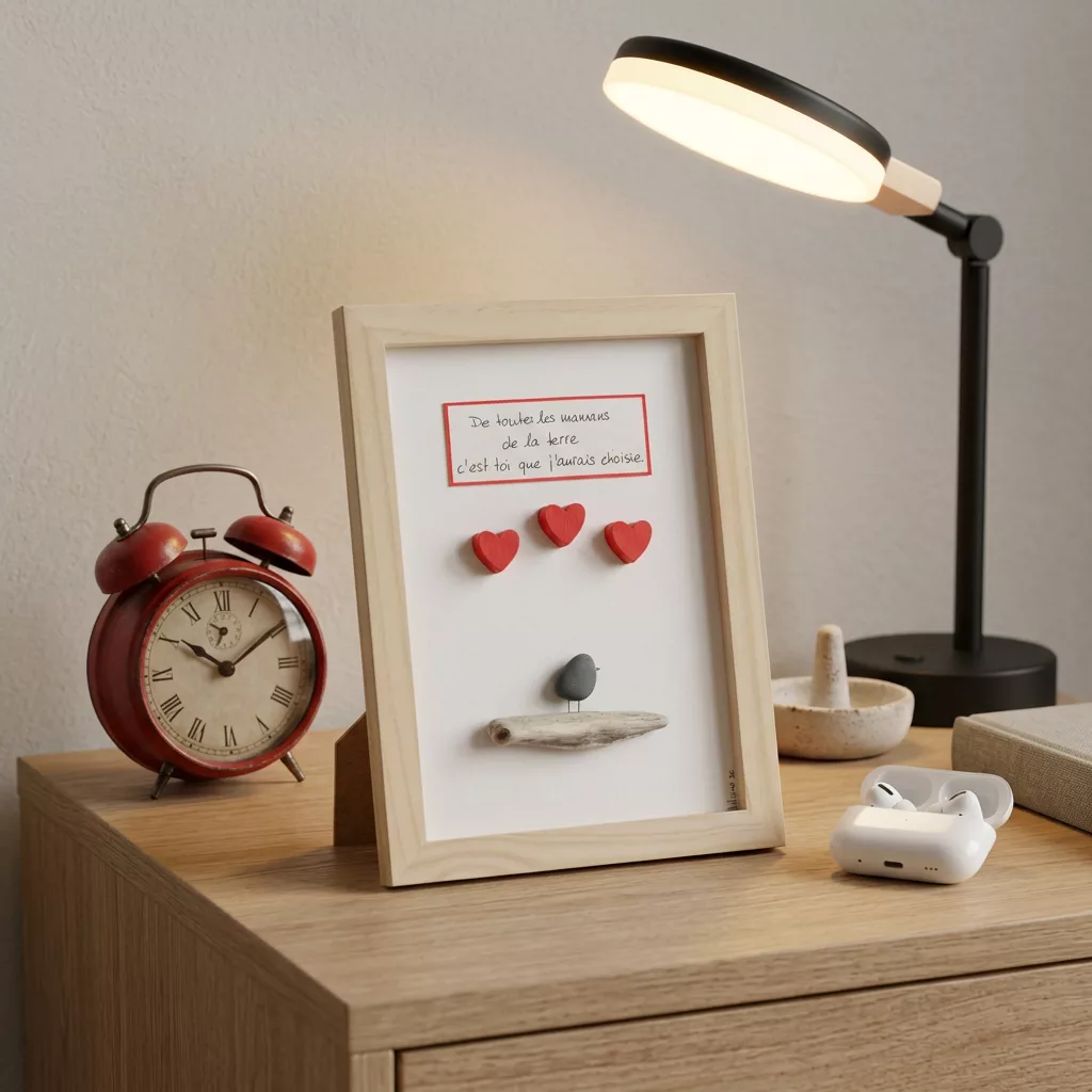 Lors de ses balades au bord du Léman et dans les campagnes genevoises, elle ramasse galets et bois flotté. De ces éléments naissent les cadres ‘’piou-pious’’ entre poésie, rêverie, authenticité et une touche de folie.